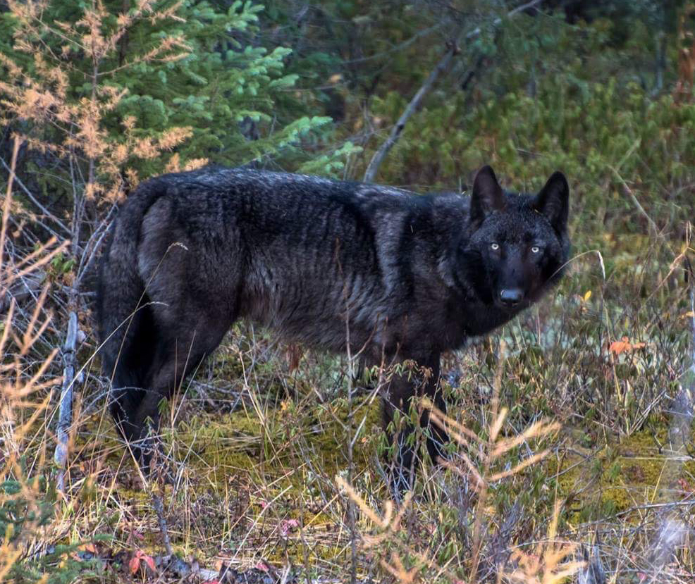 Black wolf near intersection of Liz Lake Cottage Rd and Highway #375.